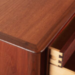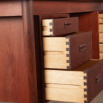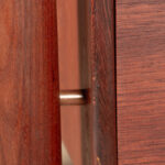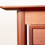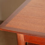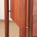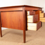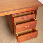 Descriptif : Beau bureau Scandinave en teck. 6 tiroirs à l’avant. 2 niches à l’arrière. Le piètement extérieur est relié au meuble par d’élégantes tenons en laiton de couleur cuivre.