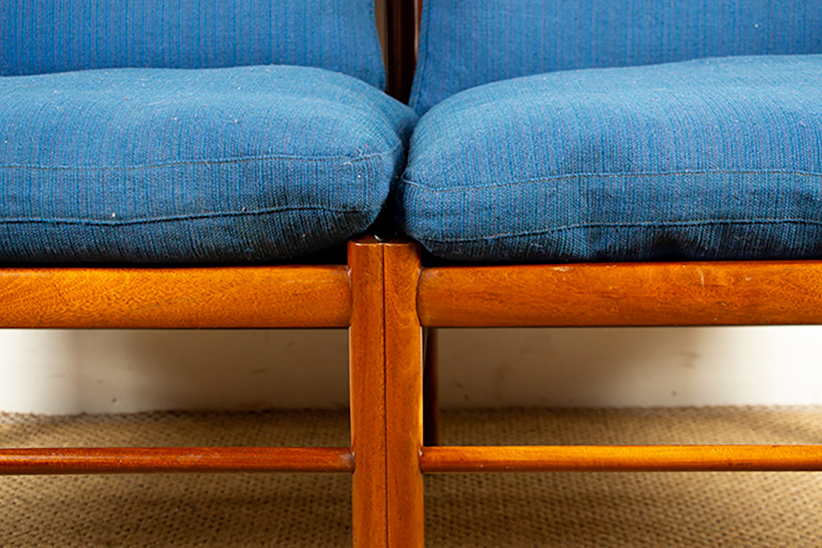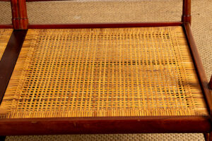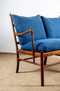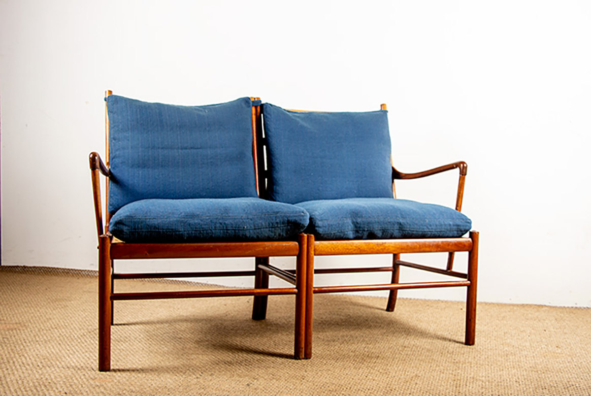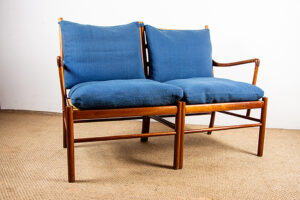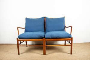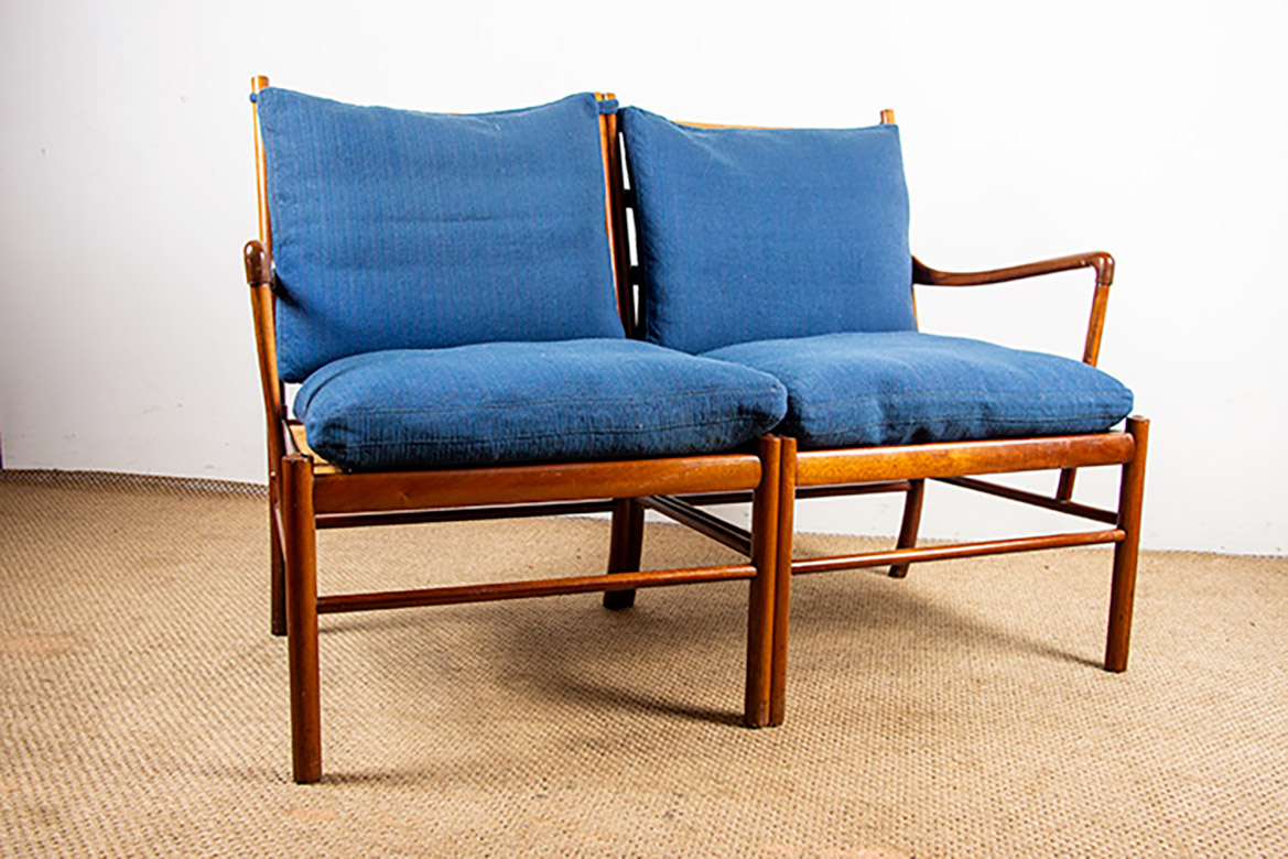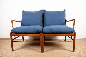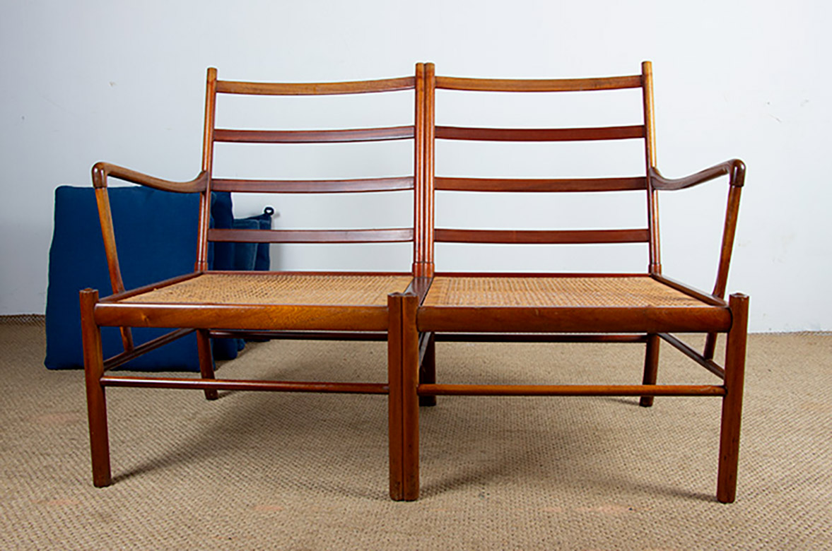 Descriptif : Superbe canapé 2 places Scandinave. Le modèle « Colonial Chair » est un meuble Iconique du designer Ole Wanscher. La structure est en Acajou, les assises en cannage, les dossiers et assises sont amovibles et recouverts de tissu de couleur naturelle. Meuble référencé au Design Museum Danemark sous le numéro RP 00133. Meuble numéroté 302025.
