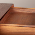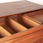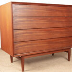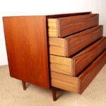 Descriptif : Magnifique Commode Scandinave en teck. 4 grands tiroirs, le tiroir du haut est équipé de petites planches en teck qui servent de séparateurs (pour couverts éventuellement) ainsi que d’un petit tiroir intérieur. Le dos est entièrement plaqué en teck pour être mis en milieu de pièce.