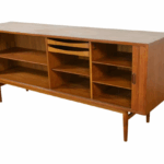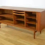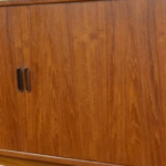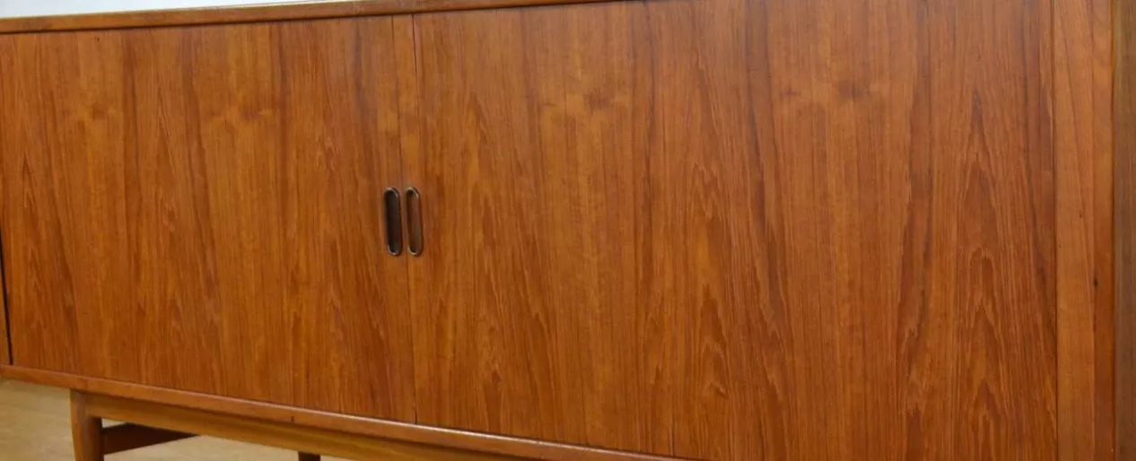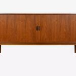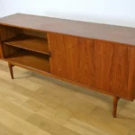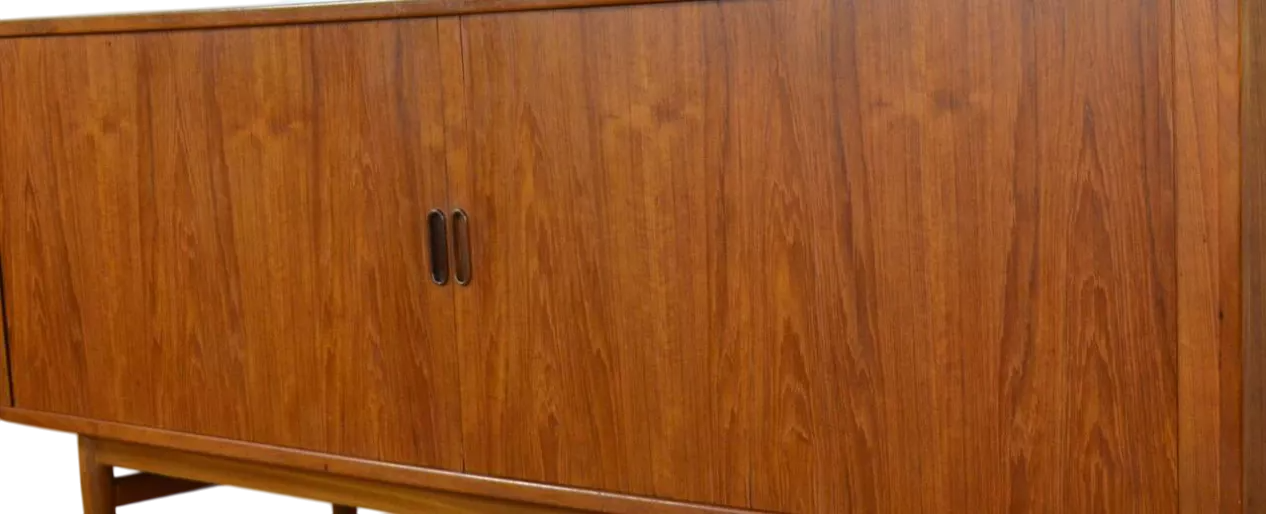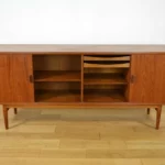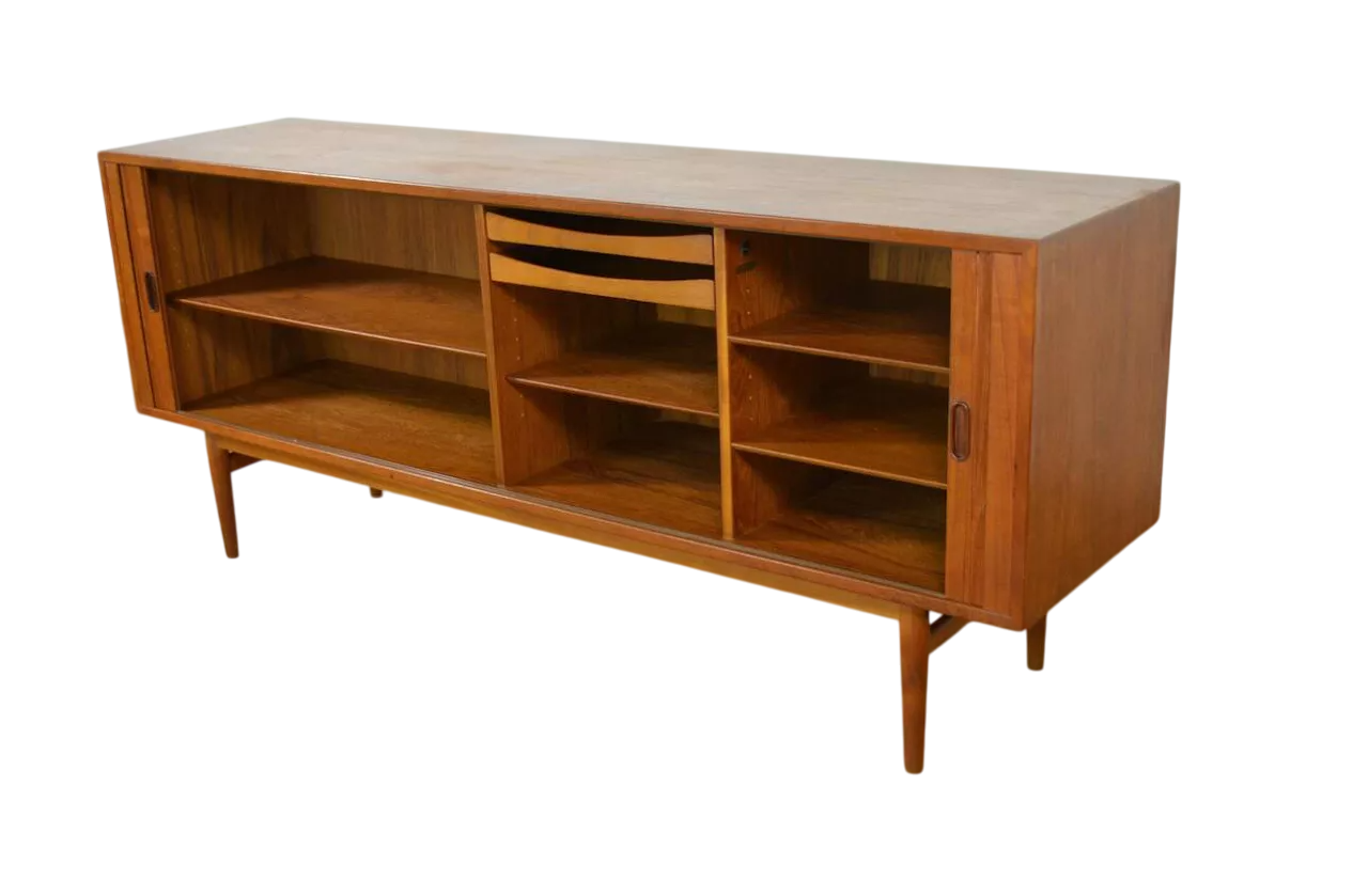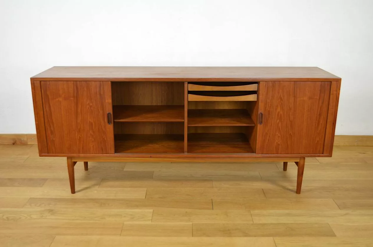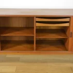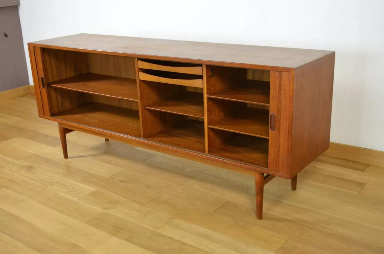 Descriptif : Magnifique Enfilade Scandinave en teck. Dessinée en 1961, cette enfilade est composée de 2 grands portes coulissantes dites « à rideaux », faites de fines lames de bois qui permettent à la porte de rentrer dans le meuble. Elles ouvrent sur 3 niches, une grande niche à gauche avec une étagère, une niche avec deux étagères à droite et au milieu, 2 tiroirs intérieurs et une étagère. Toutes les étagères sont réglables en hauteur. Le dos est entièrement plaqué en teck pour être mis en milieu de pièce.