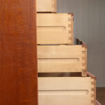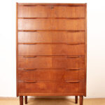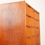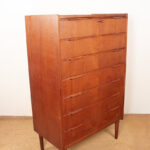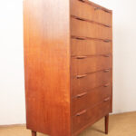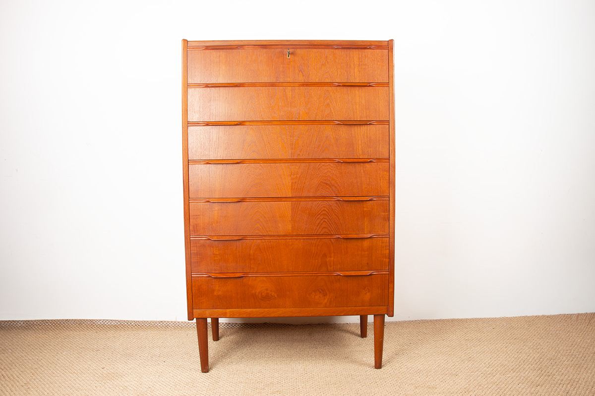 Descriptif : Superbe commode, semainier, chiffonnier Scandinave. 7 grands tiroirs, celui du haut ferme à clé (clé fournie). Meuble élégant de très belle qualité de fabrication, remarquez les poignées finement travaillées. Grande capacité de rangement. Modèle référencé au Design Museum Danemark sous le numéro RP 18661