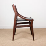Descriptif : Série de 4 chaises Scandinaves de salle à manger, assises en skaï noir, très beau veinage des boiseries. Les accoudoirs incurvés et les dossiers pleins donnent à ces chaise une grande élégance, quasi brutaliste, et un grand confort. Superbe qualité de fabrication.