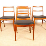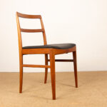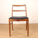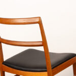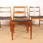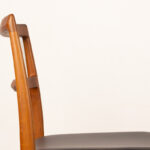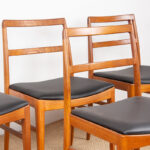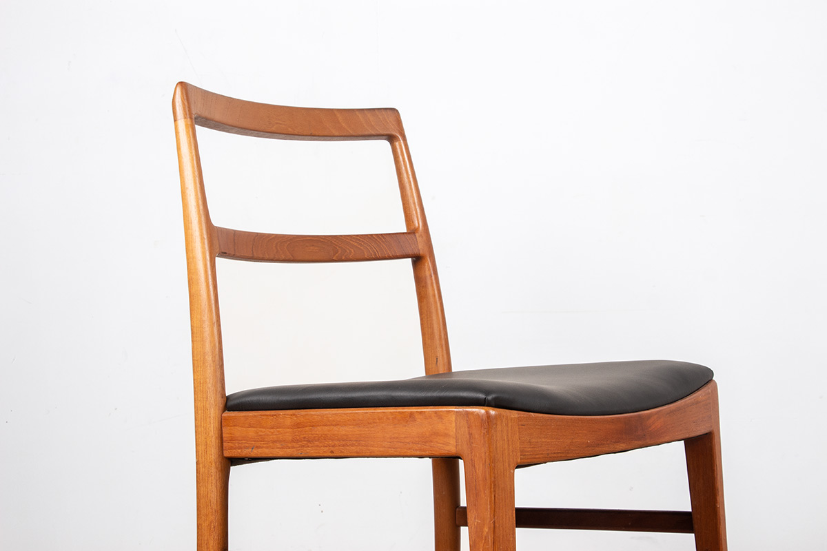 Descriptif : Série de 4 chaises Scandinaves de salle à manger, assises en cuir noir plein fleur refaites à neuf. Superbe travail d’ébénisterie, très beau veinage des boiseries, grand confort.