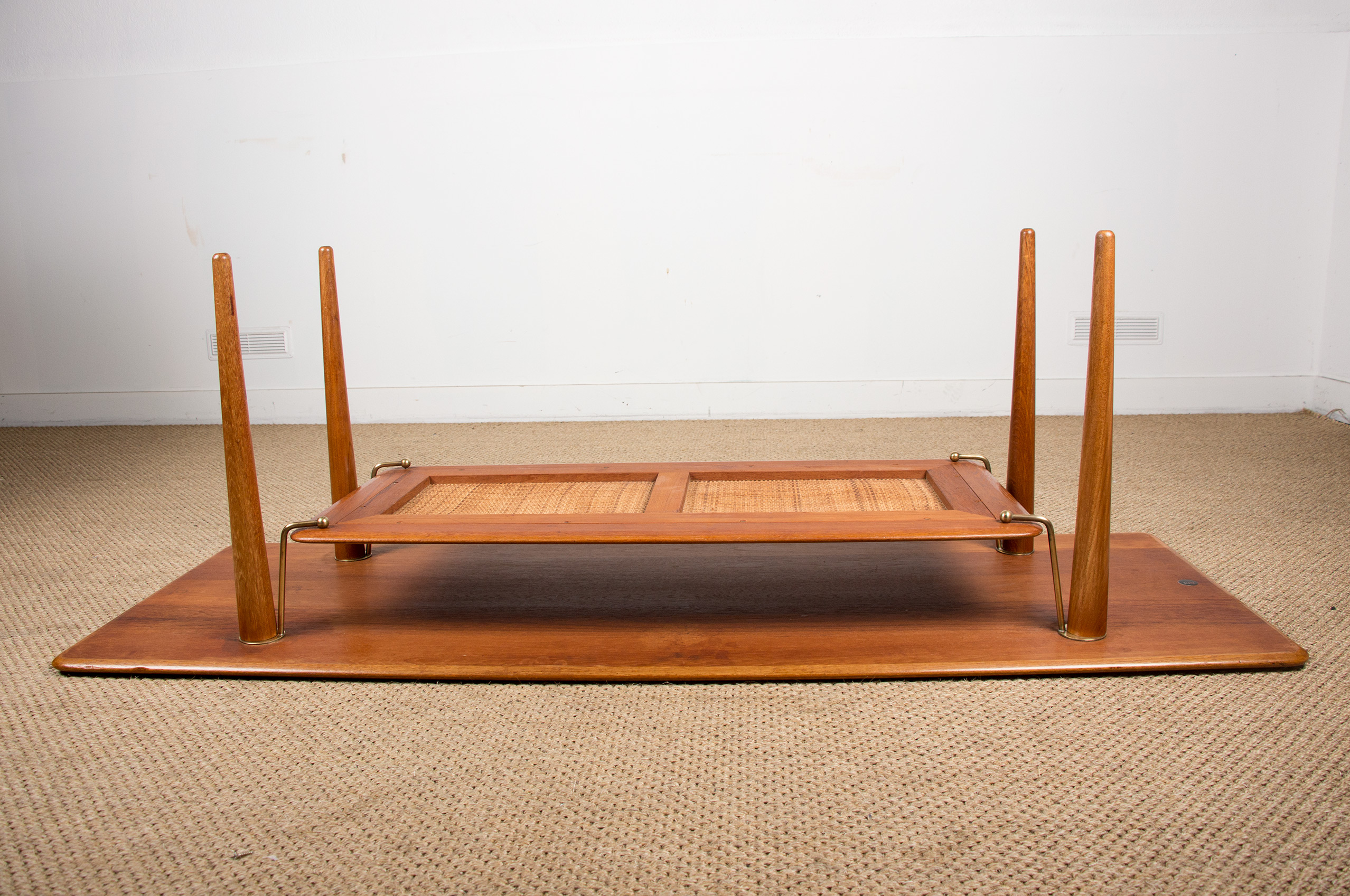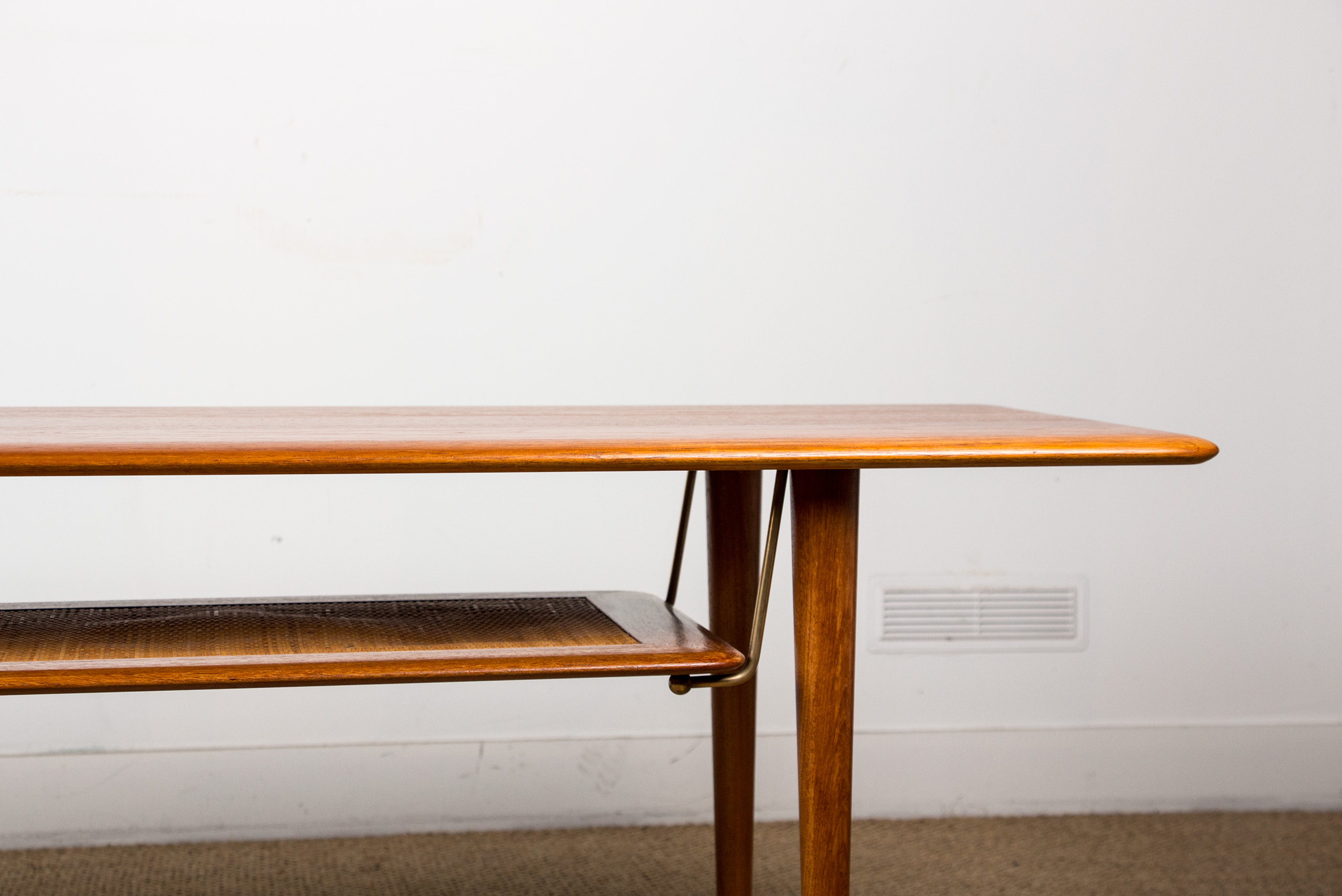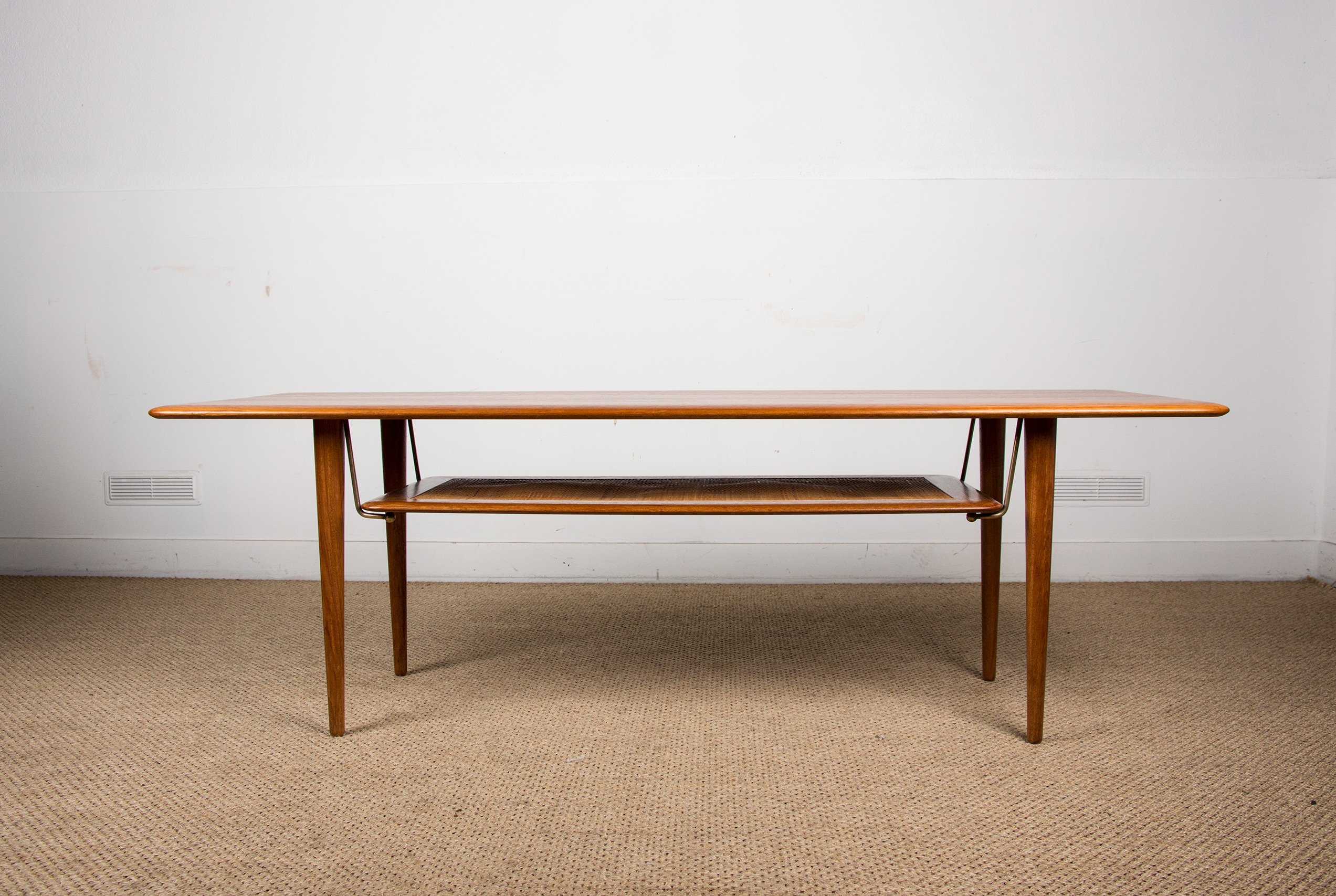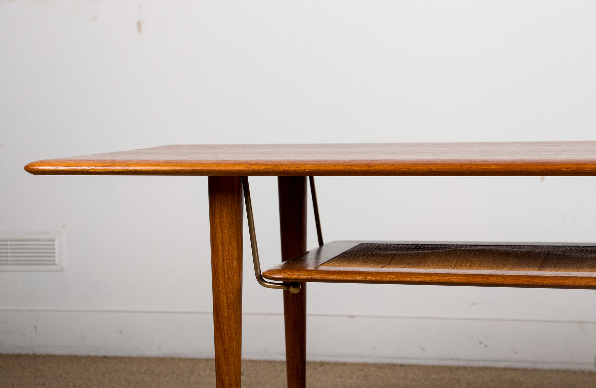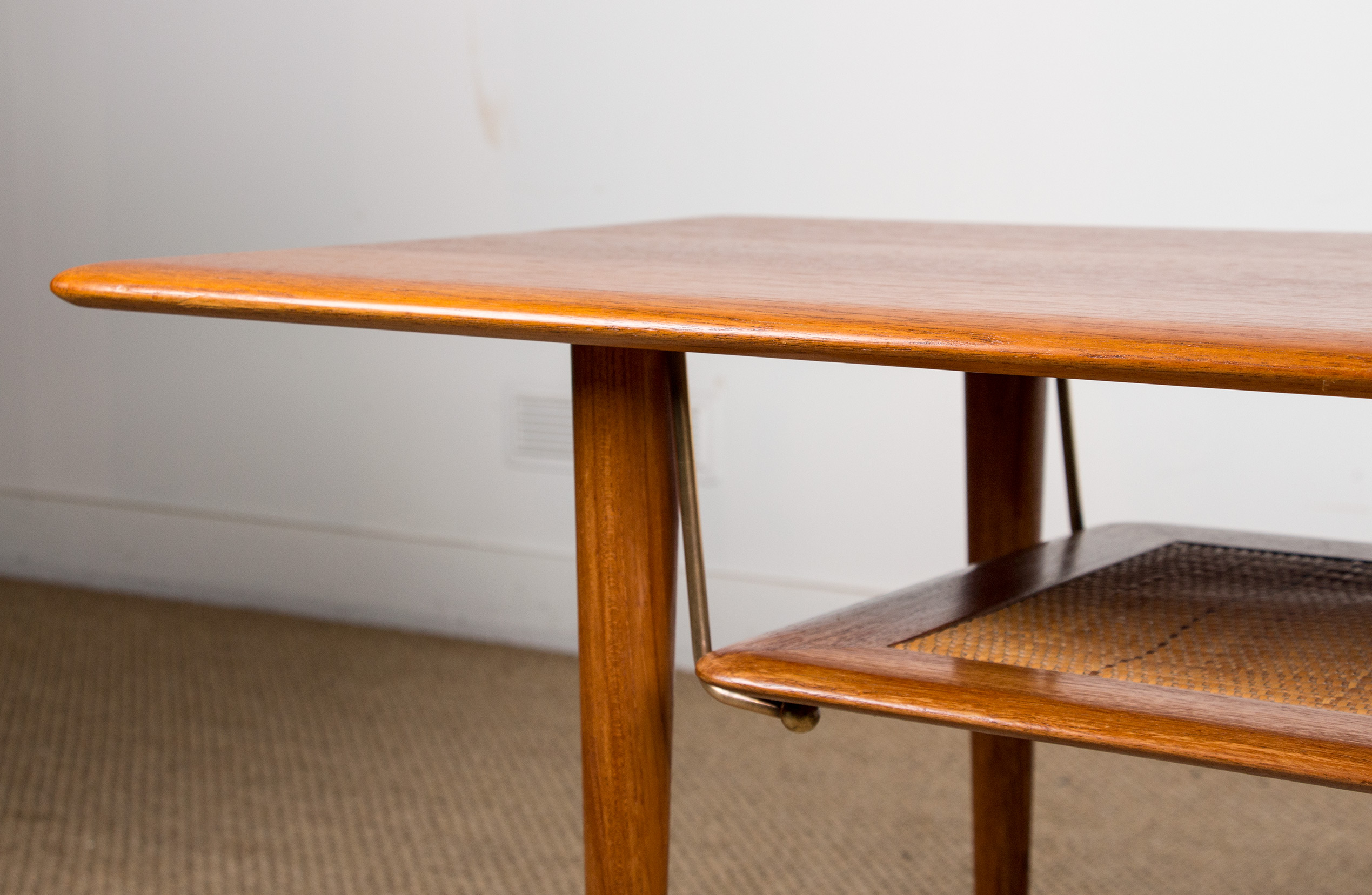 Table basse Danoise 2 niveaux en Teck, Cannage et Laiton modèle FD 516 par Peter Hvidt et Orla Moolgard pour France & Son 1956.