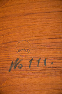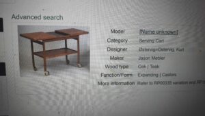 Descriptif : Superbe desserte Scandinave avec une grande surface disponible grâce à son plateau qui s’ouvre de chaque côté et donne ainsi accès à un plateau en linoleum noir et son deuxième niveau en bas. Très belle fabrication, meuble de belle facture signé Danish Furniture. Répertoriée au Design Museum Danemark sous le numéro RP 00335 (voir photo).