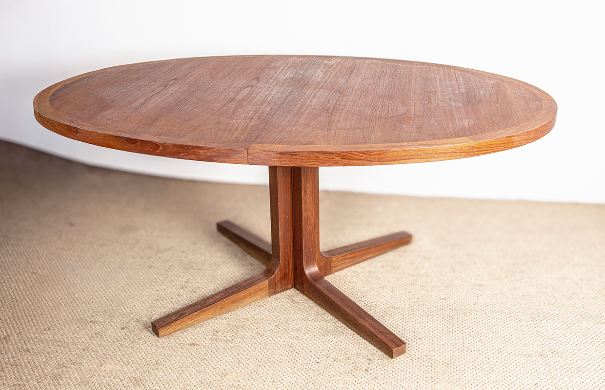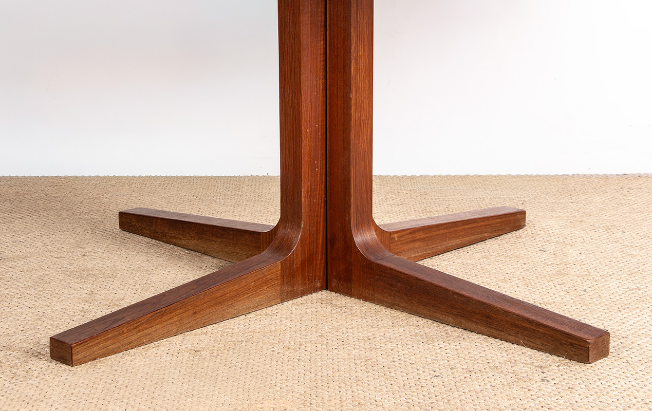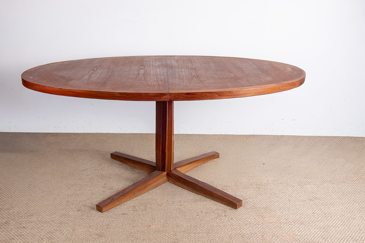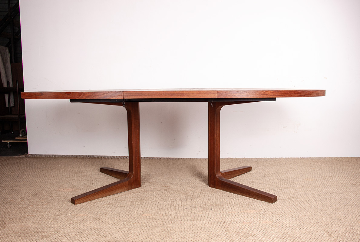Très grande table de repas Danoise en Teck, ovale et extensible, avec piètement central, modèle HM 55, par John Mortensen pour Dyrlund 1960.